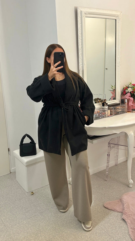 Abrigo negro de largo medio con cinturón