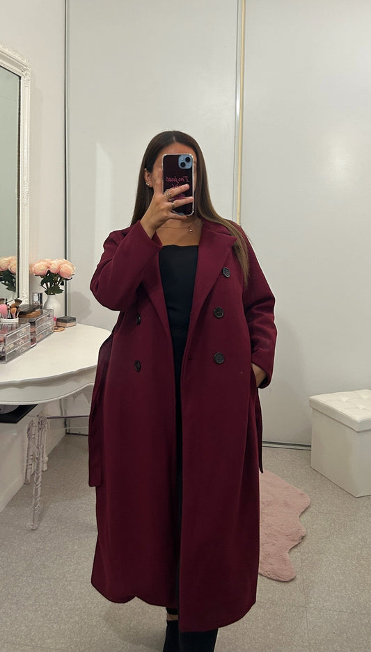 Abrigo largo burdeos con cinturón