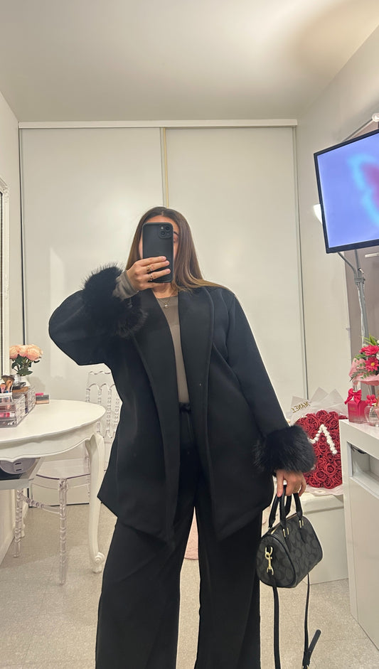 Abrigo negro de largo medio con mangas de piel