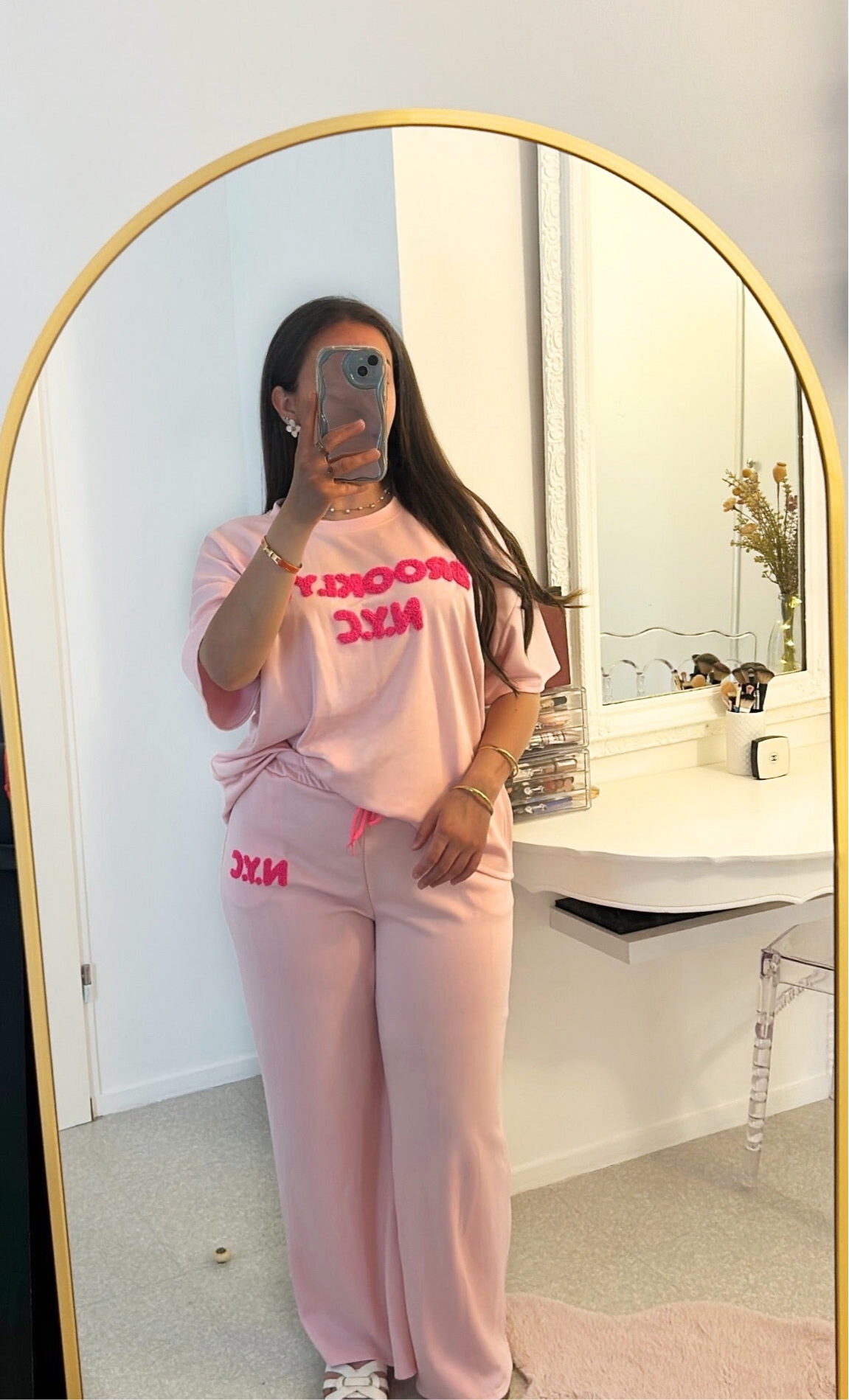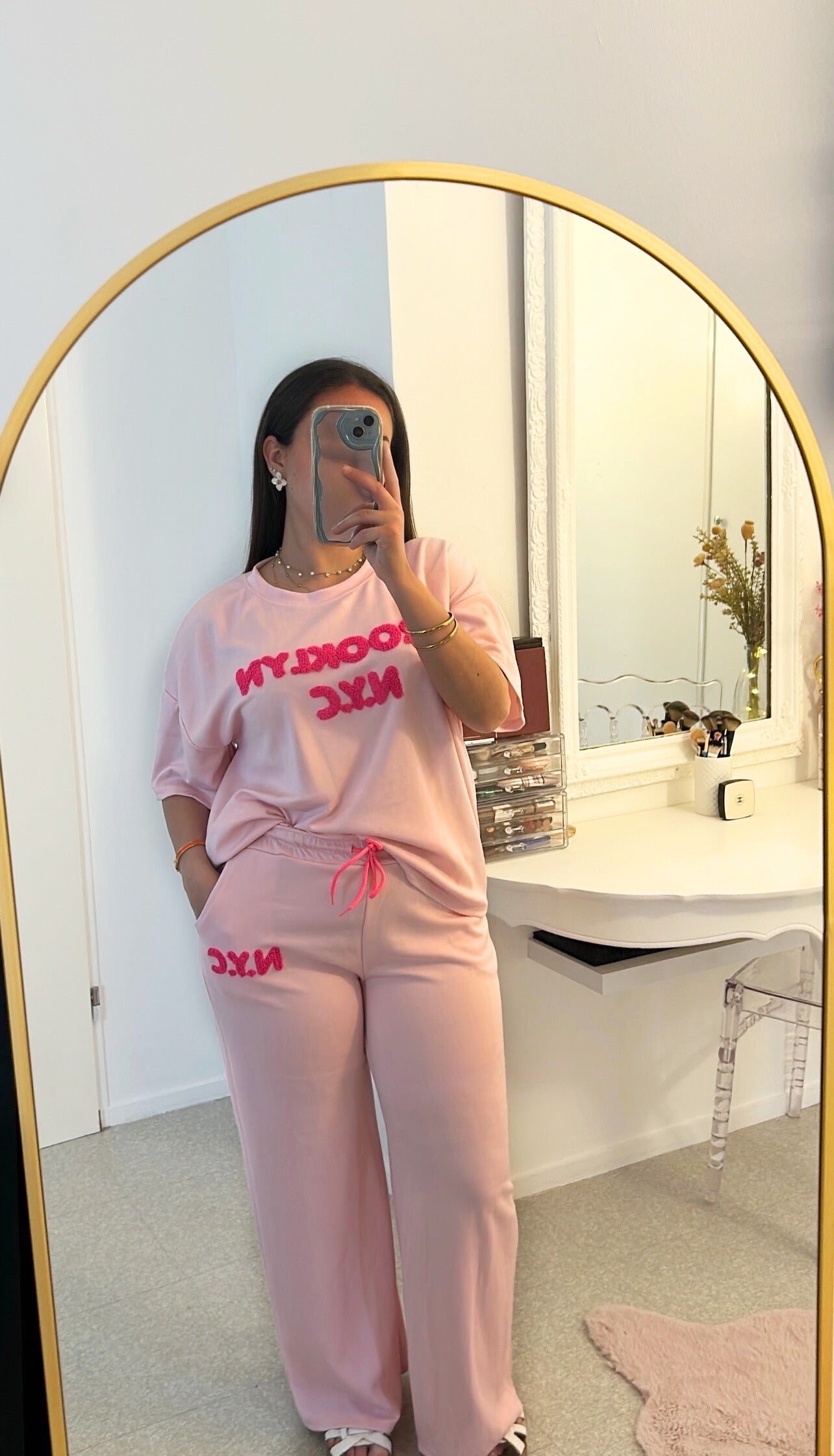 L'Ensemble demi-manches décontracté rose est pensé pour une tenue décontracté. Son pantalon taille élastique et son haut oversize avec détails manuscrit rose en coton.