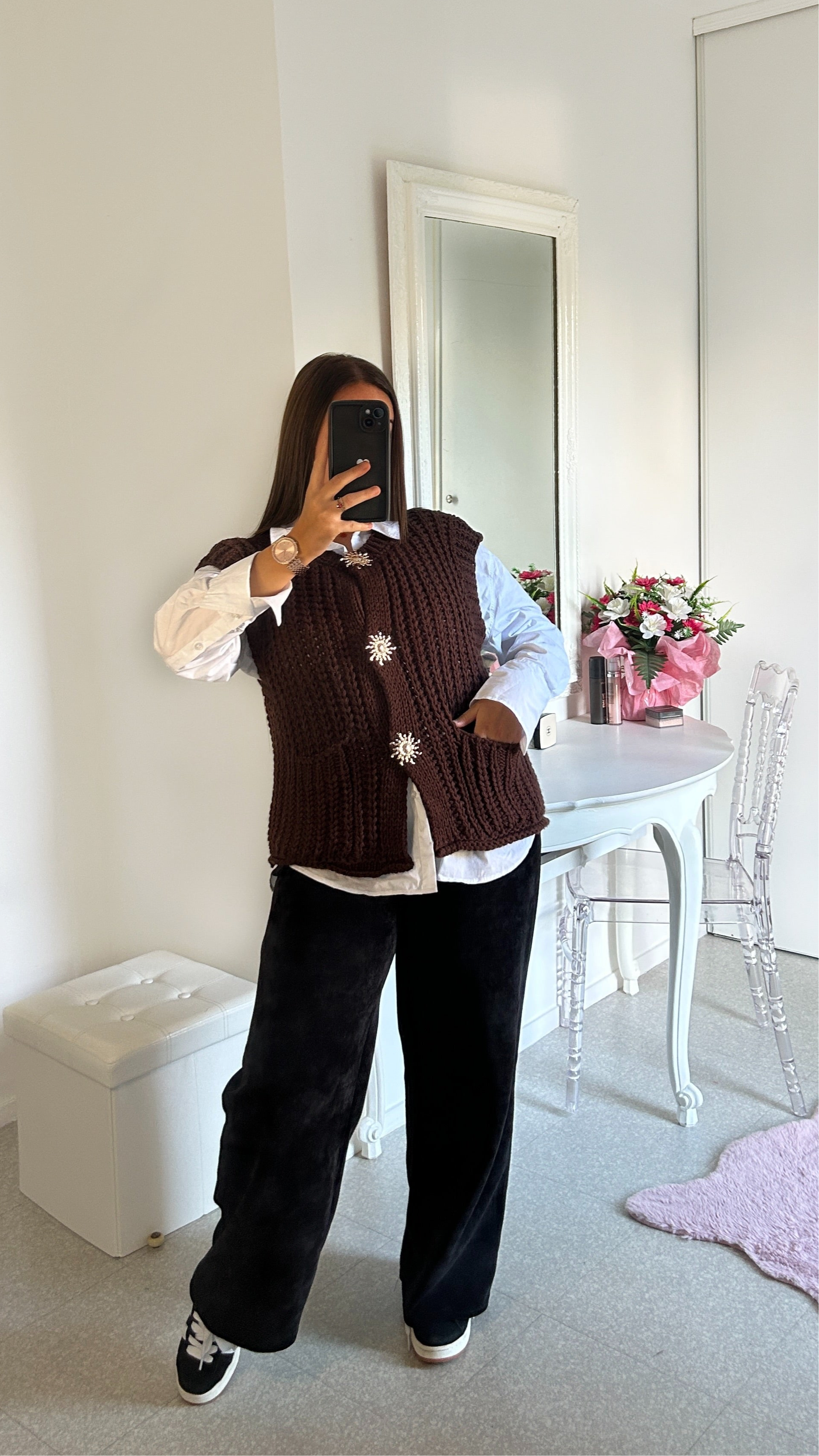 Le Pull sans manche en maille marron ajoute une touche travaillée à votre tenue. Par-dessus une chemise, il apporte une touche soignée incarnant l’esprit modest fashion.