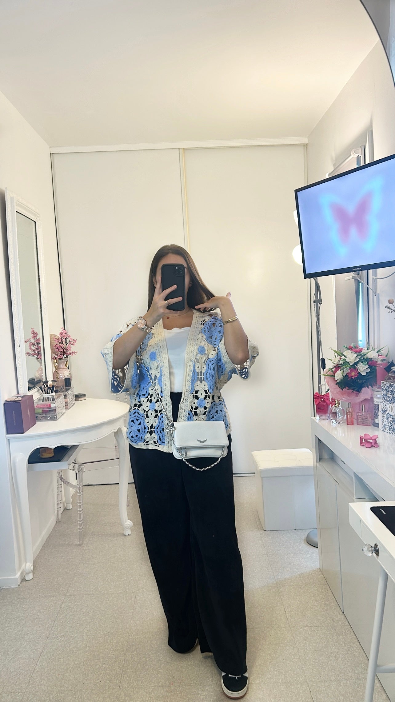 Le cardigan crochet léger bleu est la pièce idéale pour rester stylée et modeste. Très léger, Il ajoute une touche sophistiquée à toutes tes tenues.