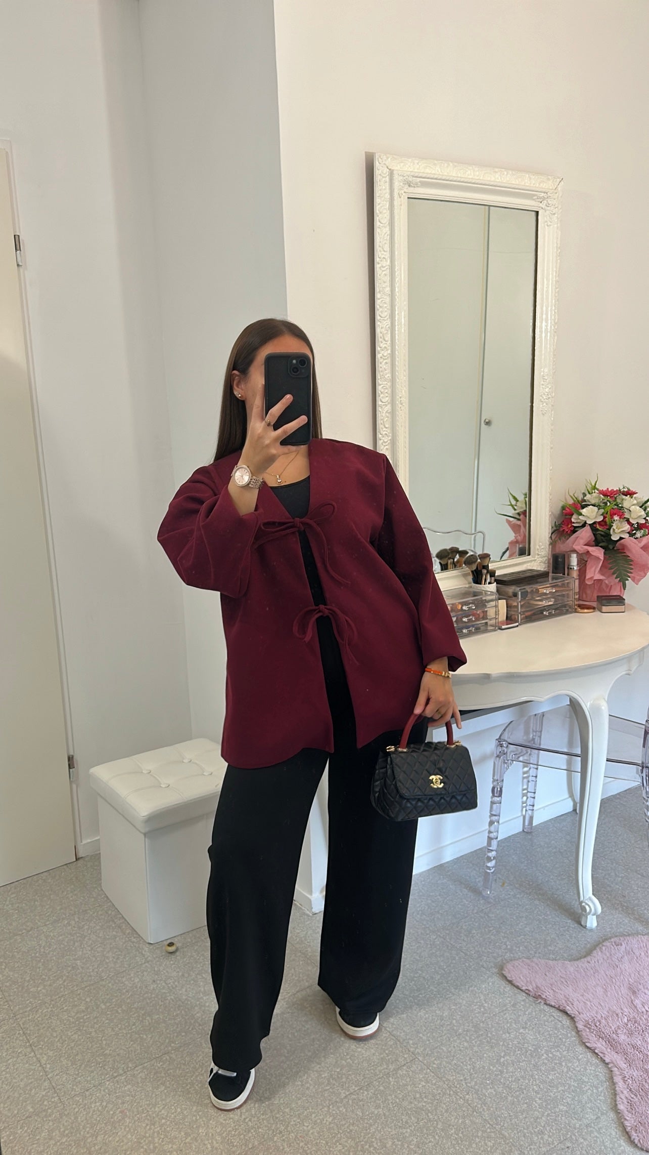 Le gilet à nœud bordeaux est la pièce idéale pour rester stylée et très comfy. Sa coupe généreuse offre un look modeste et classique. Il tient chaud tout en restant confortable, et ajoute une touche sophistiquée à toutes tes tenues.